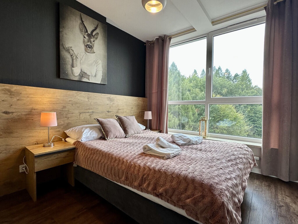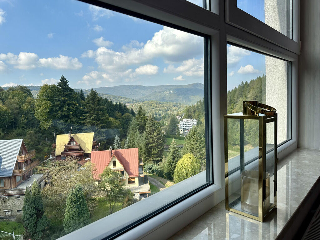 Z okien rozpościera się zachwycający widok na beskidzkie lasy i